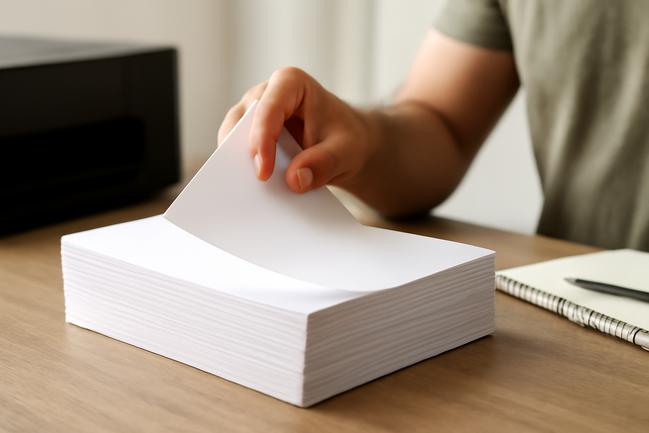 Papel A4 é o mais comum, mas alguns buscam tamanhos diferentes para projetos específicos. Compra uma quantidade que você consiga usar sem deixar muito tempo guardado, assim o papel não fica amarelado ou ressecado.
